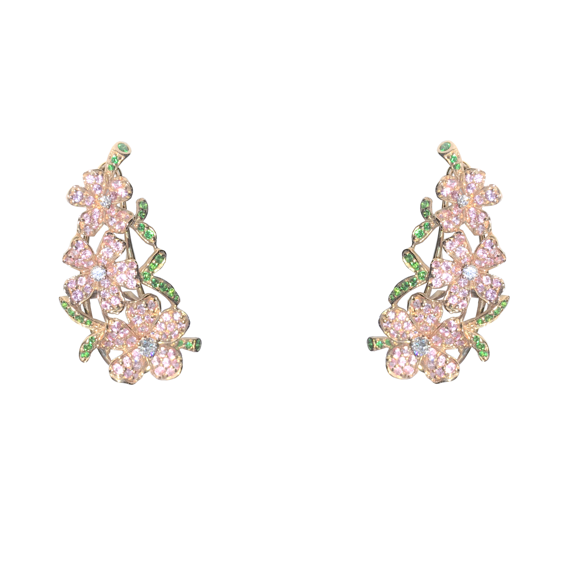 Rose gold earrings featuring white diamonds, pink sapphires, and green garnets in a delicate floral design. Elegant, colorful, and finely crafted.